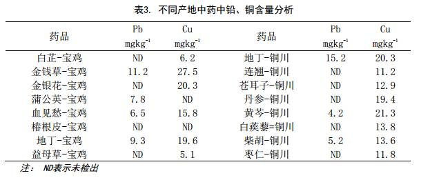 按照WM/T 2-2004《藥用植物及制劑進出口綠色行業(yè)標準》中對相關(guān)元素就有規(guī)定限值,對陜西寶雞和銅川的不同中藥中的Pb和Cu含量進行分析, 典型譜圖見圖2.