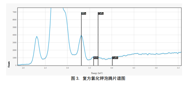對于引起的低鉀血癥通常情況下采用電解質(zhì)補充藥,復(fù)方氯化鉀泡騰片則是一種電解質(zhì)補充藥。對于藥品里的鉀元素含量分析,藥典里都有闡述,但相關(guān)對不適應(yīng)現(xiàn)場快篩監(jiān)測,采用牛津儀器X-MET8000系列HHXRF儀器可以進行篩選,判斷成份含量。圖3是對藥品進行譜圖掃描,鉀元素的譜線非常清晰。