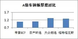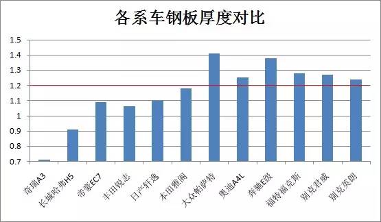從整體來看我們可以發(fā)現(xiàn),表現(xiàn)差的并不是日系車,而恰恰是我們的自主品牌。抽樣調(diào)查的幾個(gè)自主品牌汽車鋼板厚度平均值均僅在1mm上下,而有些品牌車型的鋼板厚度平均值甚至還不到1mm。