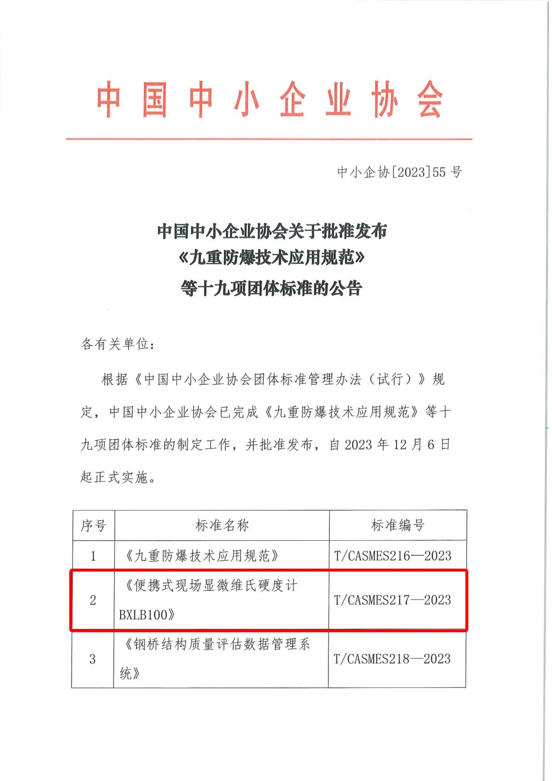 2023年12月6日,由我公司里博儀器牽頭制定的《便攜式現(xiàn)場顯微維氏硬度計(jì)BXLB100:T/CASMES217-2023》團(tuán)體標(biāo)準(zhǔn)正式發(fā)布并實(shí)施,該項(xiàng)標(biāo)準(zhǔn)是我公司發(fā)布的首項(xiàng)全國性團(tuán)體標(biāo)準(zhǔn)。