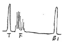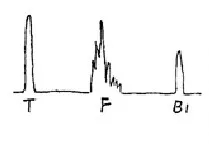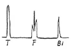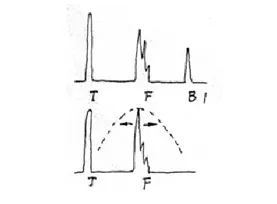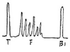 軸類鍛件中的縱向內(nèi)裂,直探頭圓周探傷,聲束平行于裂紋時(shí),既無(wú)底波也無(wú)傷波,當(dāng)探頭轉(zhuǎn)動(dòng)90°時(shí)反射波最強(qiáng),呈現(xiàn)裂紋波形,有時(shí)會(huì)出現(xiàn)裂紋的二次反射,一般無(wú)底波。底波與傷波出現(xiàn)特殊的變化規(guī)律(如圖)。