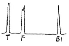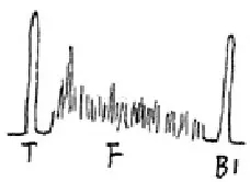 軸類鍛件中的縱向內(nèi)裂,直探頭圓周探傷,聲束平行于裂紋時(shí),既無(wú)底波也無(wú)傷波,當(dāng)探頭轉(zhuǎn)動(dòng)90°時(shí)反射波最強(qiáng),呈現(xiàn)裂紋波形,有時(shí)會(huì)出現(xiàn)裂紋的二次反射,一般無(wú)底波。底波與傷波出現(xiàn)特殊的變化規(guī)律(如圖)。